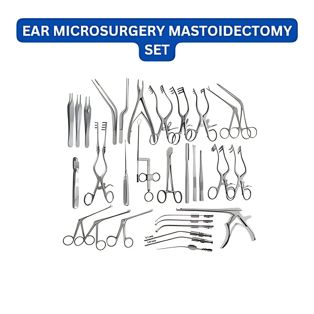 Included Instruments:1. Hartmann ear forceps, cup jaws 2 mm diameter, working length 8 cm x1pcs 2. Suction tube,cylindrical,luer working length 11 cm,o.d: 3 mm x2pcs 3. Suction Tube, Cylindrical LUER, Working length 11 cm, O,D: 4 mm x1pcs 4. Plester sickle knife, double- edged,standard model, slightly curved, length 16 cm x1pcs 5. House curette, medium, spoon size 1 x 1.8 mm and 2 x 3.5 mm, lenge 15 cm x2Pcs 6. HOUSE Curette, medium, spoon sizes 1×1.8 mm and 2×3.5mm, Lange 15cm x1Pcs 7. Pick 90 0 ,16 cm, 1.0 mm x1pcs 8. Fisch micro hook, 2.5 mm, 45 0 , length 16 cm x1Pcs 9. plester knife, round, vertical, 16 cm, standard size 3.5 x 2.5 mm x2Pcs 10. Surgical handle fig.3, length 12.5 cm for blades x1Pcs 11. HOUSE-DIETER Malleus Nipper, working length 8 cm upbiting x1pcs 12. FISCH Micro Raspatory, curved, right, 16 cm x1Pcs 13. FISCH Micro Raspatory, curved, left, length 16 cm x2Pcs 14. BELLUCCL Scissors, Working Length 8 Cm, 8 Mm Blade, Delicate, Standard x1pcs 15. BELLUCCI Scissors, working length 8 cm, 8 mm blade, delicate, standard x1Pcs 16. Section Cannula, angular, LUER-Lock, working length 6 cm, 1.3 mm x1Pcs 17. FISCH Adaptor, with cut-off hole, LUER cone, length 5.5 cm, with Suction Tubes x1Pcs 18. PLASTER Elevator, 18 cm, 8mm wide x1Pcs 19. WULLSTEIN Retractor, 3×3 prongs 13cm x1Pcs 20. FISCH Retractor, 2×2 prongs, 13 cm x1pcs 21. WULLSTEIN Needle. 16.5 cm, light curve x1Pcs 22. Round Knife 45 0 , 16cm, diameter: 2.5 mm x2Pcs 23. Scissors, delicate, 10cm, straight x2Pcs 24. ‘’Mosquito” Artery Forceps, MICRO-Model, 12.5 cm, curved x4 Pcs 25. MAYO Scissors, curved, length 15 cm x2Pcs 26. Sterilizing Box With Silicone Matt to hold the instruments x1 Pcs